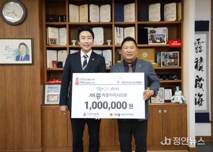 정안뉴스 안정주 기자 | 세종특별자치시의회는 19일 의장 집무실에서 세종사회복지공동모금회에 성금을 기탁하는 ‘희망 2026 나눔 캠페인’ 성금 전달 행사를 진행했다.