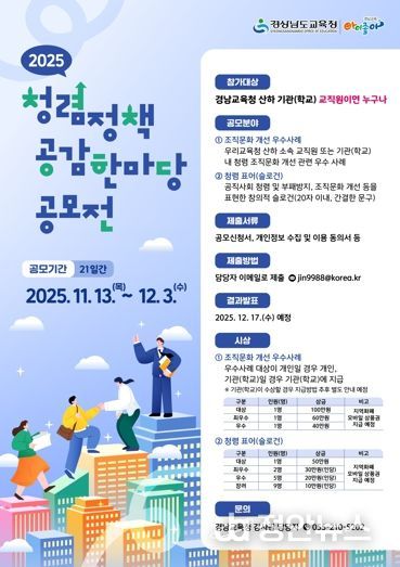정안뉴스 김재홍 기자 | 경상남도교육청은 반부패·청렴 문화를 확산하기 위해 추진한 ‘2025년 청렴 정책 공감 한마당 공모전’의 수상작을 발표했다.