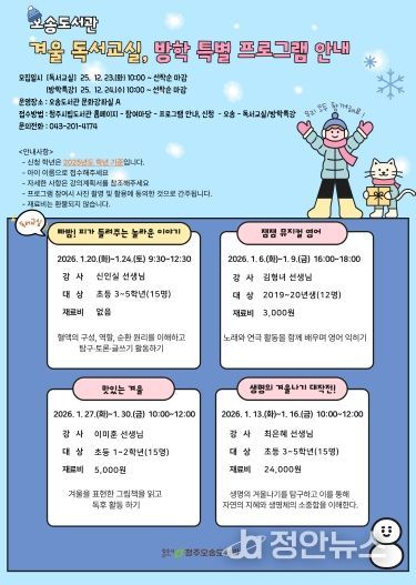 정안뉴스 황은경 기자 | 청주오송도서관 권역 내 7개관(오송·서원·흥덕·신율봉·강내·옥산·가로수)은 겨울방학을 맞아 독서교실 및 방학 특별프로그램 수강생을 모집한다.