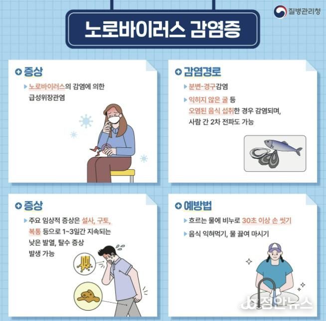 아울러 노로바이러스 감염증 환자는 증상이 호전된 이후에도 48시간 동안 등원·등교 및 출근을 자제해야 하며, 환자가 사용한 공간이나 화장실, 분변 또는 구토물에 오염된 물품은 락스 희석액을 사용해 철저히 소독해야 한다.