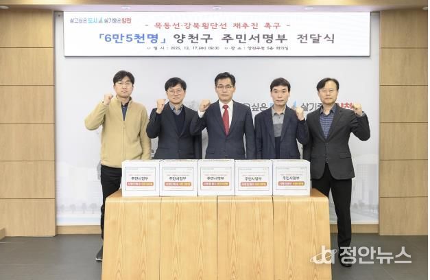 정안뉴스 안정주 기자 | 양천구는 ‘목동선 및 강북횡단선 재추진 촉구’ 주민 서명운동을 완료하고, 6만 5천 명의 서명부를 모아 지난 17일 전달식을 개최하며 본격적인 대외 건의 활동에 나선다고 밝혔다.