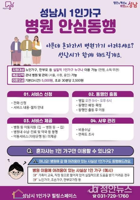 정안뉴스 안정주 기자 | 성남시는 ‘1인 가구 병원 안심 동행 서비스’ 추진을 위해 전문 인력을 기존 4명에서 5명으로 늘렸다고 22일 밝혔다.