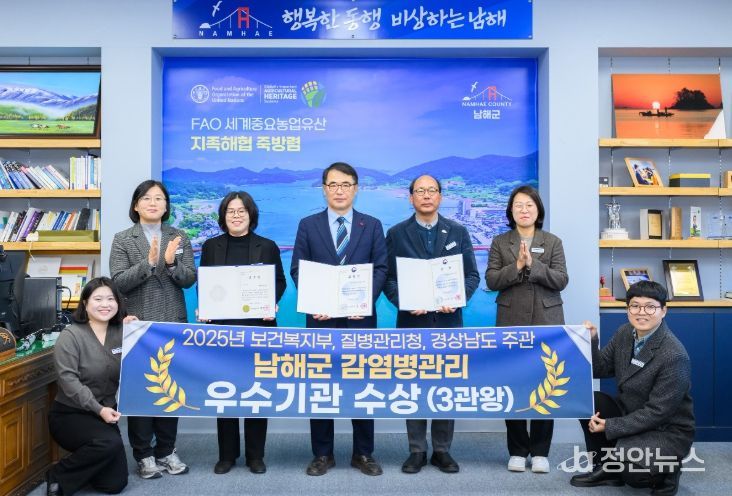 정안뉴스 김재홍 기자 | 남해군은 2025년 감염병 예방 및 관리에 기여한 공로를 인정받아 감염병관리분야에서 3개 기관 표창을 수상했다고 밝혔다.