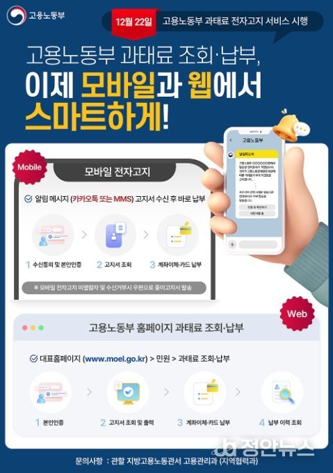 정안뉴스 안정주 기자 | 고용노동부는 고용노동관계법 위반 과태료 고지서의 간편한 조회·납부를 위해 과태료 전자고지 시스템을 구축하고, 12월 22일부터 서비스를 시작한다.