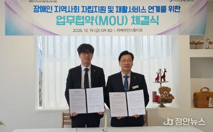 정안뉴스 황도연 기자 | 서산시장애인지역사회자립지원시범사업단과 서산시장애인복지관은 2025년 12월 19일, 서산시에 거주하는 장애인의 안정적인 지역사회 정착과 복지 향상을 위해 업무협약(MOU)을 체결했다.