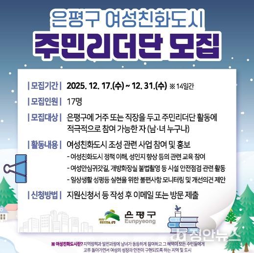 정안뉴스 안정주 기자 | 서울 은평구는 여성친화도시 조성을 위해 함께 할 ‘여성친화도시 주민리더단’ 단원을 새로 모집한다고 밝혔다.