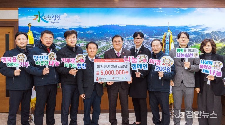 김윤철 합천군수는 “매년 나눔을 실천해주시는 합천군시설관리공단의 따뜻한 마음에 진심으로 감사드리며, 소중한 성금은 꼭 필요한 이웃에게 전달될 수 있도록 하겠다”고 감사의 마음을 전했다.