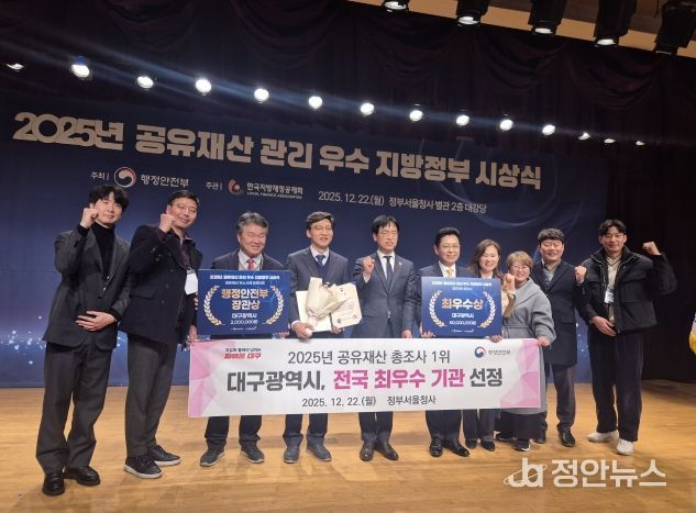 정안뉴스 안정주 기자 | 대구광역시는 12월 22일 행정안전부 주최 ‘2025년 공유재산 우수 지방자치단체 시상식’에서 공유재산 총조사 부문 최우수 기관 선정과 더불어, 공유재산 우수사례 경진대회에서 우수상(장관상)을 수상하는 등 공유재산 관리와 활용 분야에서 최고 수준의 역량을 입증했다.