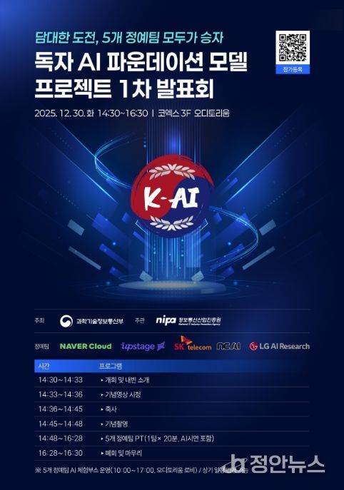 정안뉴스 안정주 기자 | 과학기술정보통신부와 정보통신산업진흥원(원장 박윤규)은 오는 12월 30일 14:30, 코엑스 오디토리움에서, 「독자 AI 파운데이션 모델」 프로젝트 1차 발표회를 개최한다.