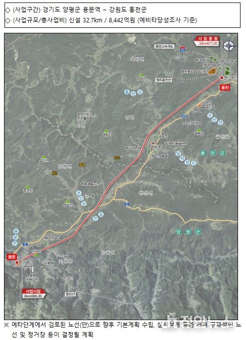 정안뉴스 안정주 기자 | 국토교통부는 12월 22일 열린 재정사업평가위원회(기획재정부 주관)에서 용문~홍천 광역철도 건설사업이 예타를 통과하고, 증평-호법 등 2개 고속도로 확장사업이 예타 대상 사업에 선정됐다고 밝혔다.