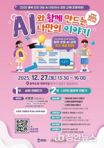 정안뉴스 황은경 기자 | 충청북도는 오는 12월 27일 13:30 충북도청 대회의실에서 도내 초등학생(3~6학년)과 학부모 200여명을 대상으로 ‘AI 웹툰 교육(중부권 2차)’을 진행한다고 밝혔다. 이번 교육은 북부권(충주), 남부권(옥천), 중부권 1차(청주)에 이어 2025년 마지막으로 개최되는 도내 AI 창작 체험 프로그램이다.