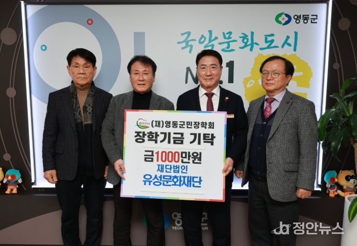 정안뉴스 황은경 기자 | 충북 영동군은 재단법인 유성문화재단이 22일 오후 영동군청을 방문해 지역 인재 육성을 위한 영동군민장학금 1,000만 원을 기탁했다고 밝혔다.