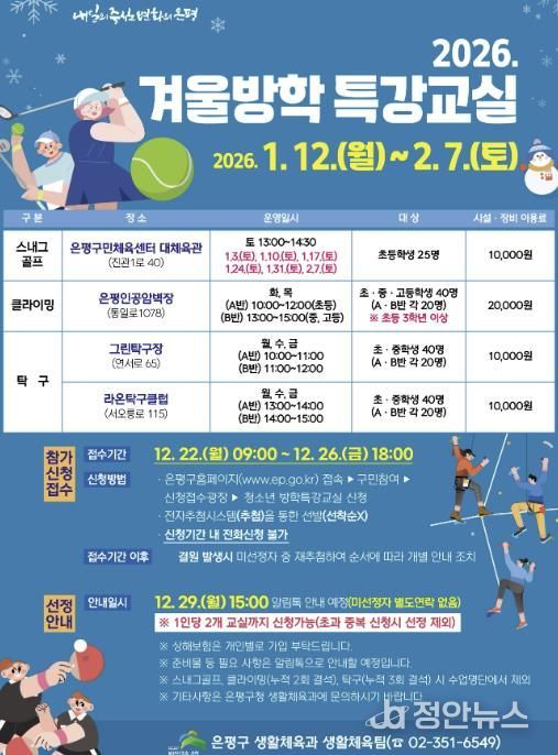 정안뉴스 안정주 기자 | 서울 은평구는 겨울방학을 맞아 청소년들의 건강증진과 건전한 여가 활동을 지원하기 위해 ‘2026년 청소년 겨울방학 생활체육 특강교실’을 운영한다고 밝혔다.