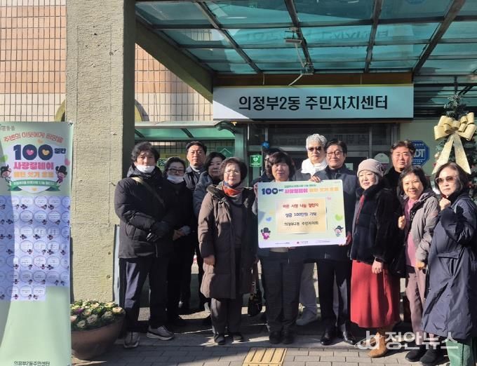 정안뉴스 안정주 기자 | 의정부시 의정부2동주민센터는 12월 22일 의정부2동 주민자치회가 ‘100일간 사랑릴레이 배턴 잇기’에 동참해 취약계층을 위한 성금 100만 원을 전달했다고 밝혔다.