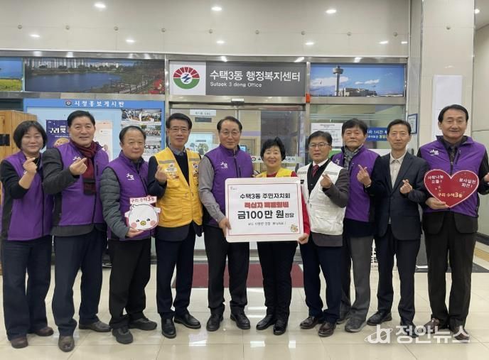 정안뉴스 안정주 기자 | 구리시 수택3동 주민자치회는 지난 12월 22일 지역 내 어려운 이웃을 지원하기 위해 적십자 특별회비 100만 원을 대한적십자사에 전달했다.