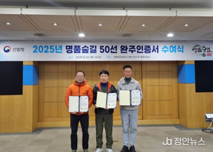 정안뉴스 안정주 기자 | 산림청은 ‘명품숲길 50선 완주인증제’를 14일까지 완료하고, 전 구간을 완주한 인증자 23명을 대상으로 완주인증 수여식을 개최했다고 22일 밝혔다.