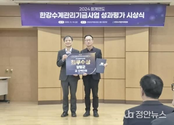 정안뉴스 안정주 기자 | 양평군은 지난 19일 한강유역환경청이 실시한 ‘2024년도 한강수계관리기금 성과평가’에서 주민지원사업 부문 최우수, 오염총량관리사업 부문 장려를 수상했다고 밝혔다.