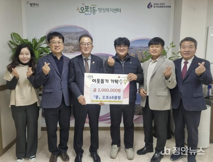 오포68클럽은 지역사랑 봉사 활동을 목적으로 오포 권역 내 1968년생을 주축으로 2004년 결성된 친목 단체다. 이번에 기탁된 성금은 오포 권역 4개 동(오포1·2동, 능평동, 신현동)의 취약계층을 지원하는 데 사용될 예정이다.