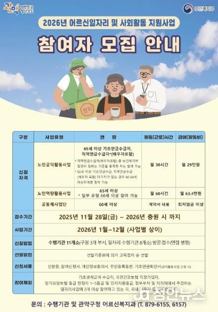 정안뉴스 안정주 기자 | 관악구가 초고령시대 진입을 앞두고 어르신들의 사회참여 증진과 노후 소득 보장을 위해 ‘2026년 노인일자리 및 사회활동 지원사업’을 대폭 확대 추진한다.