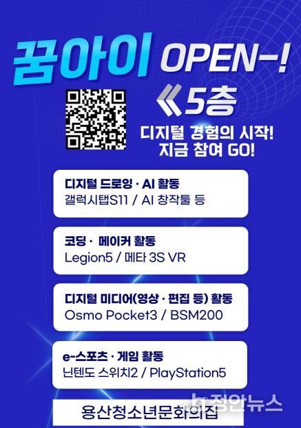 ‘꿈아이 인공지능(AI) 디지털체험실’은 청소년들이 인공지능(AI) 및 디지털 기술을 체험하고 창작 활동을 할 수 있는 참여형 학습 공간이다. 용산꿈나무종합타운 내에 위치하며, 향후 지역 학교 및 청소년 관련 기관들과 협력하여 인공지능(AI)·디지털 교육의 중심지로 활용될 예정이다.