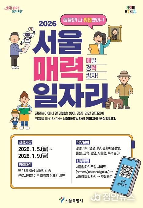 정안뉴스 안정주 기자 | 서울시는 직무교육과 실제 일 경험을 통해 민간 취업으로 연계하는 대표 디딤돌 일자리 사업인 ‘서울 매력일자리’를 2026년 총 3,600명 규모로 확대 운영한다.
