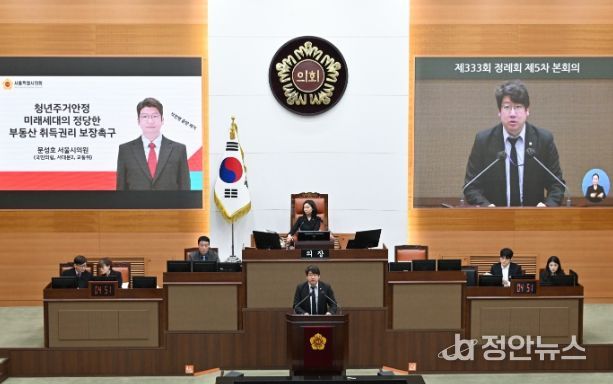 정안뉴스 안정주 기자 | 문성호 서울시의원(국민의힘, 서대문2)이 제333회 서울특별시의회 정례회 마지막 본회의에서 1990년 서대문구 등 서울시에서 발생한 부동산폭력단 오씨 사건을 예로 들며, 범죄행위로 취득한 불법 수익이 환수되지 않고 아직도 버젓이 호화를 누리는 행태를 비판하며, 이로 인해 현재 서울시민의 주거 안정은 거주 불안으로 바뀌었으므로 이를 바로잡아 정당한 부동산 취득권리를 보장해야 함을 주장했다.