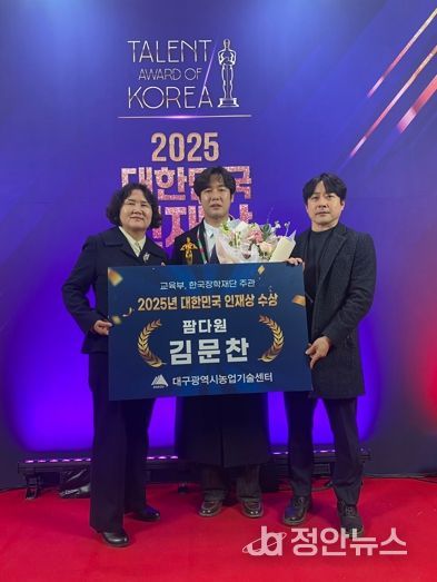 정안뉴스 안정주 기자 | 대구 청년농업인 김문찬 팜다원 대표가 12월 24일 세종시 정부세종컨벤션센터에서 열린 ‘2025년 대한민국 인재상’ 시상식에서 대한민국 인재상을 수상했다.