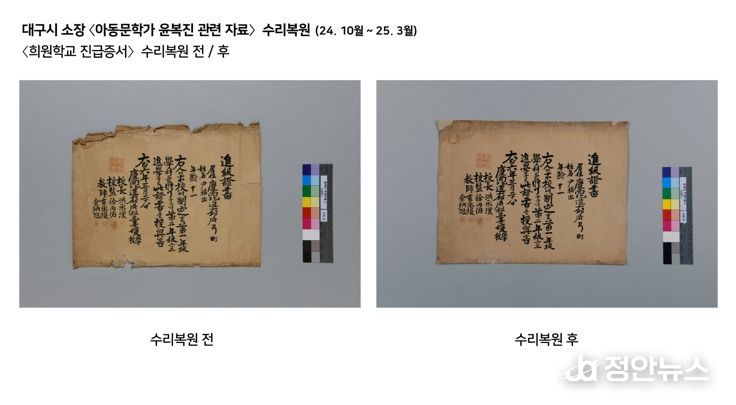 대구시(문화유산과) 소장 〈아동문학가 윤복진 관련 자료〉는 가요곡집과 졸업앨범 등 지역을 대표한 작가의 활동과 우리나라 동요사를 재조명하는 자료로 중요성을 인정받는 문화유산이었지만, 근대기 제작된 종이 수급이 어려워 수리복원에 많은 난항을 겪었다. 이에 대구간송미술관 수리복원팀은 자료와 유사한 종이를 직접 제작하여 결손부 보완 및 낙장 부분에 적용했고, 주변부와 유사한 색으로 색맞춤했다. 수리복원이 완료된 자료들은 지난 5월 대구예술발전소에서 개최된 전시 ‘수리복원, 기억을 잇다’를 통해 소개되며, 지역 출신 아동문학가 윤복진을 재조명하는 계기를 마련했다.
