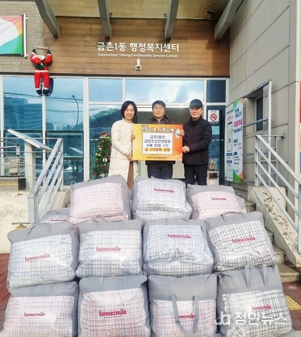 정안뉴스 안정주 기자 | 파주시 금촌1동은 지난 24일 금촌5일장 금정로 상인연합회로부터 375만 원 상당의 이불 30채를 기탁 받았다고 밝혔다.