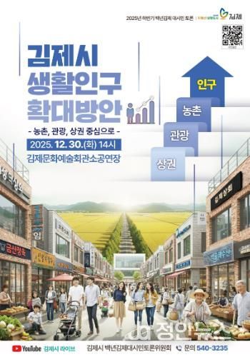 정안뉴스 안정주 기자 | 김제시는 오는 30일 오후 2시 김제예술회관 소공연장에서 ‘농촌, 관광, 상권을 중심으로 김제시 생활인구 확대방안’에 대한 백년김제 대시민 토론회를 개최한다고 밝혔다.