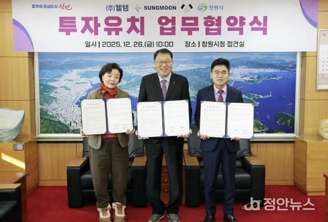 정안뉴스 김재홍 기자 | 창원특례시는 26일 시청 접견실에서 ㈜웰템, 성문(주) 2개 기업과 총 234억 원 규모의 투자와 70명 신규 고용을 내용으로 하는 투자협약(MOU)을 체결했다고 밝혔다.