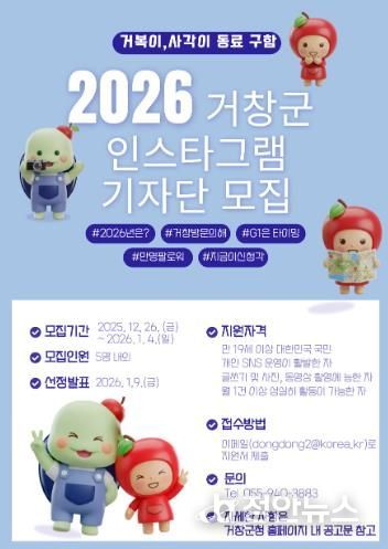 정안뉴스 김재홍 기자 | 거창군은 지역 관광자원의 매력을 생생하게 전달하고 온라인 홍보를 강화하기 위해 ‘2026년 거창군 인스타그램 기자단’을 모집한다고 26일 밝혔다.