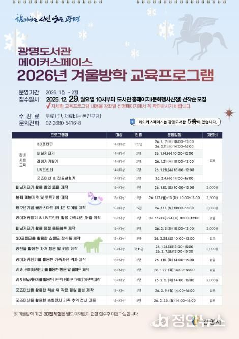 정안뉴스 안정주 기자 | 광명시 광명도서관은 오는 29일부터 ‘메이커스페이스 2026년 겨울방학 교육 프로그램’ 참가자를 모집한다.