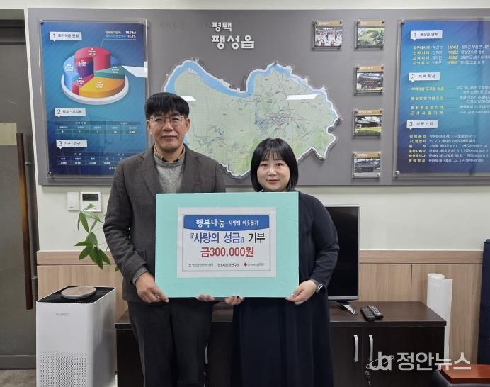 정안뉴스 안정주 기자 | 경토리민요연구소의 박정은 대표는 지난 24일, 팽성읍 행정복지센터를 방문해 저소득 가구 지원을 위한 성금 30만 원을 전달했다.