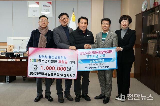 정안뉴스 김재홍 기자 | 경남개인택시조합 양산시지부(지부장 장태영)은 26일 양산시를 방문해 인재육성장학재단(이사장 이희종)에 장학금 300만원과 1388청소년지원단에 후원금 100만원을 기탁했다.
