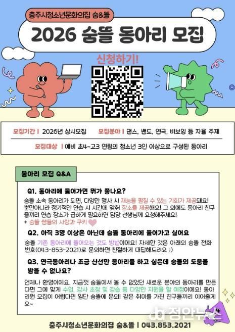 정안뉴스 황은경 기자 | 충주시청소년문화의집 숨&뜰은 2026년 한 해 동안 청소년들의 자율적인 문화 활동을 지원하기 위해 청소년 동아리를 상시 모집한다고 밝혔다.