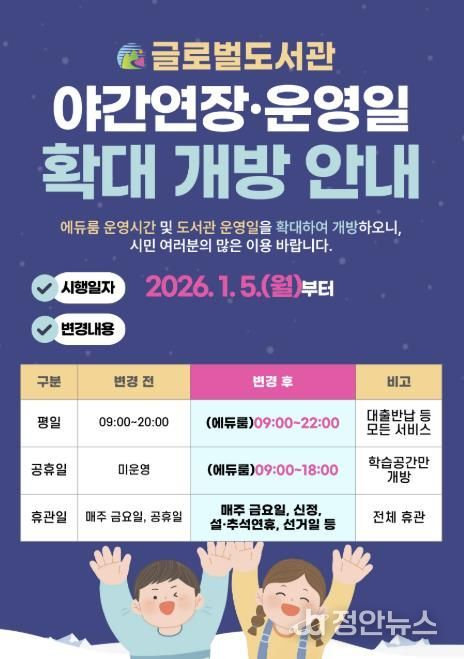 또한, 글로벌도서관은 기존 공휴일에 운영되지 않던 에듀룸 학습공간을 오전 9시부터 오후 6시까지 개방해 학생과 시민들의 안정적인 학습 활동을 지원할 계획이다.