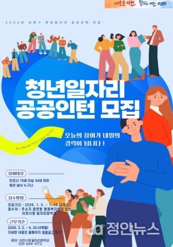 정안뉴스 안정주 기자 | 이천시는 2026년 1월 5일부터 1월 16일까지 ‘청년일자리 공공인턴사업’의 상반기 참여자 47명을 모집한다.