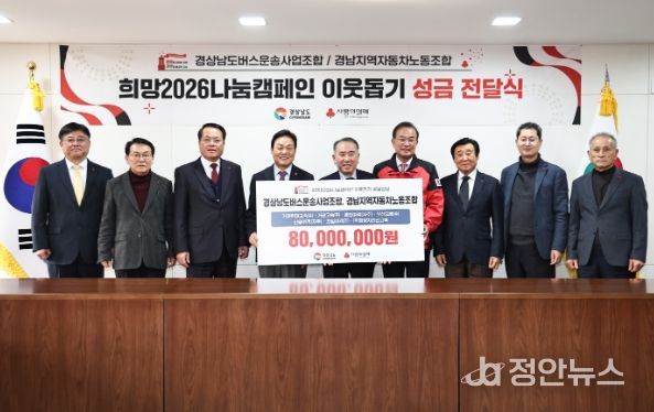 정안뉴스 김재홍 기자 | 경상남도는 29일 도청 소회의실에서 경남버스운송사업조합(이사장 양기환)과 경남지역자동차노동조합(위원장 박지훈)이 도내 취약계층을 돕기 위한 성금 8천만 원을 전달했다고 밝혔다.