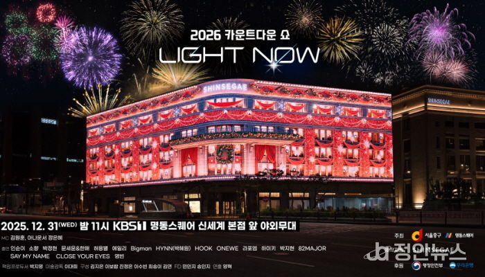 정안뉴스 안정주 기자 | 서울 중구는 오는 12월 31일 밤 11시, 명동스퀘어 일대에서 열리는〈2026 카운트다운 쇼 LIGHT NOW〉를 'KBS1TV'와 'KBS 유튜브' 채널을 통해 전 세계에 생중계한다고 밝혔다. 행사 현장에 방문하지 못하더라도 TV와 모바일을 통해 편안하게 새해의 감동을 함께할 수 있다.