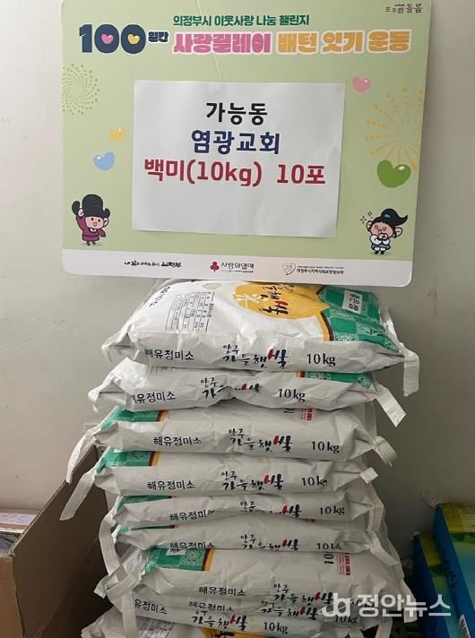 정안뉴스 안정주 기자 | 의정부시 가능동주민센터는 12월 26일 의정부 염광교회가 연말을 맞아 백미 10포(10kg 단위)를 기탁하며 ‘100일간 사랑릴레이 배턴 잇기’에 동참했다고 밝혔다.