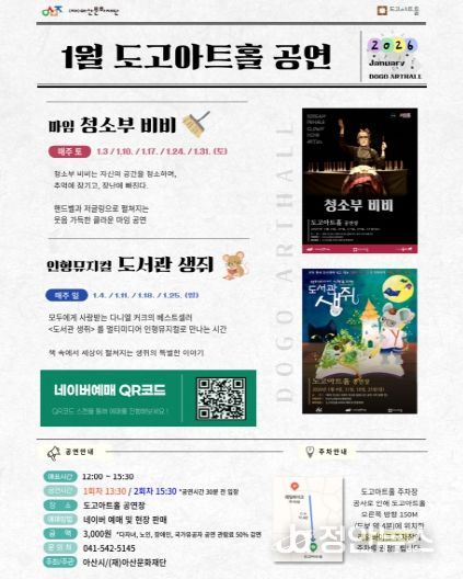 정안뉴스 황도연 기자 | 아산문화재단(대표이사 유성녀)이 운영하는 도고아트홀이 2026년 1월, 주말 상시 공연과 전시를 통해 새해 시민들의 문화 일상화를 이어간다. 이번 프로그램은 가족 단위 관람객과 어린이를 중심으로 공연과 전시를 함께 즐길 수 있도록 구성돼 있어, 새해 첫 달부터 풍성한 문화 향유 기회를 제공한다.