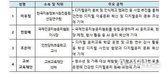 ‘디지털윤리 문화조성 유공’ 표창에는 디지털윤리 교육 및 인식 제고에 기여한 공로로 이유정 한국지능정보원 선임과 전창배 국제인공지능윤리협회 이사장, 조은아 인천당하초등학교 교사, 교보교육재단(단체)이 선정됐다.
