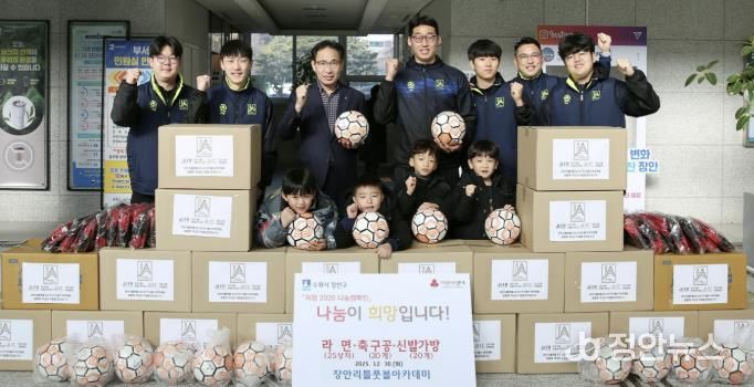 정안뉴스 안정주 기자 | 수원시 장안구는 장안리틀풋볼아카데미가 지난 30일 장안구청에 라면 25상자와 축구공 20개 기부했다고 밝혔다. 이번 기부는 아카데미 회원들이 십시일반으로 정성을 모아 마련한 것으로, 장안구 관내 어려운 이웃들에게 전달될 예정이다.