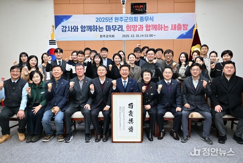 정안뉴스 안정주 기자 | 완주군의회는 31일 문화강좌실에서 11명 군의원 전원과 의회사무국 직원 등 40여 명이 참석한 가운데 2025년도 종무식을 개최했다.