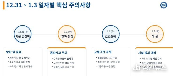 정안뉴스 안정주 기자 | 전북자치도는 31일 해넘이와 1월 1일 해맞이를 앞두고 기온 급강하와 대설 가능성이 있는 가운데 도민과 방문객의 안전한 연말연시를 위해 현장 안전관리에 총력을 기울인다.