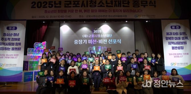 정안뉴스 안정주 기자 | 군포시청소년재단은 2025년 한 해를 마무리하고 새로운 도약을 다짐하기 위해 '2025년 미션·비전 선포식'을 개최했다.
