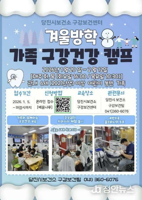 정안뉴스 황도연 기자 | 당진시보건소는 겨울방학을 맞이하여 온 가족이 함께 참여할 수 있는 가족 구강건강 캠프를 운영한다고 2일 밝혔다.