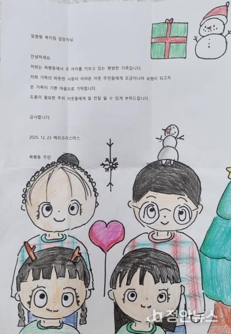 편지는 두 아이를 키우는 가정이라는 소개와 함께 도움이 필요한 이웃을 위하는 따뜻한 마음과 아이들이 직접 그린 눈사람, 선물 상자 등으로 꾸며져 따스함을 더했다.