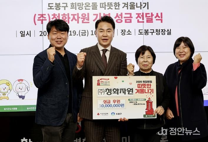 정안뉴스 안정주 기자 | 서울 도봉구는 지난 12월 19일 지역의 재활용 업체인 청화자원으로부터 성금 1,000만 원을 전달받았다. 전달받은 성금은 장애인연합회 세 곳에 전달될 예정이다.